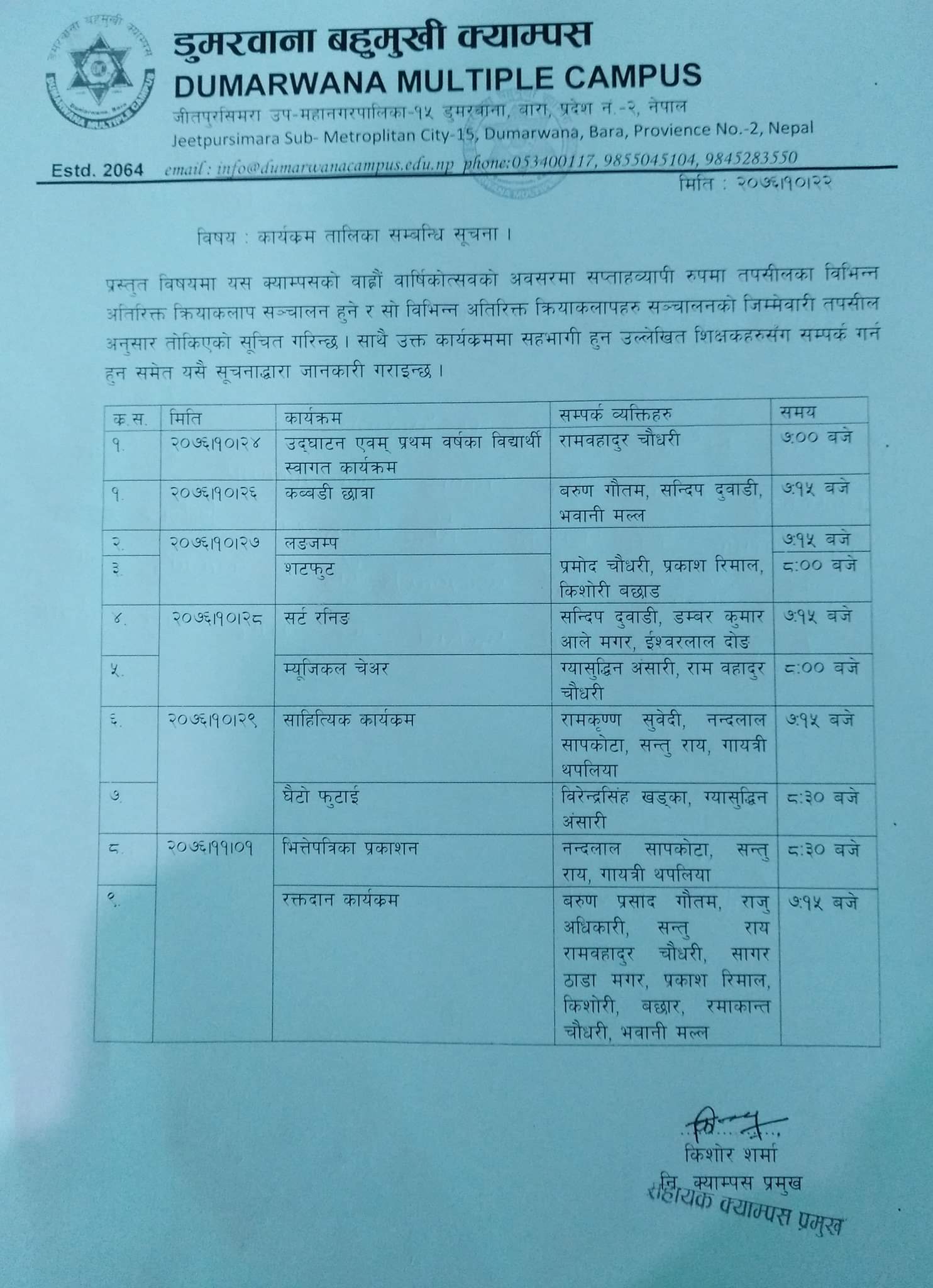Dumarwana Multiple Campus, founded in 2064 B.S affiliated from Tribhuvan University is a non-profit making community-based campus. The campus has been running graduation classes in three faculties: Education, Humanities and Management. The campus seems to be ahead in the district form the academic development point of view. Different innovative and recent methods and techniques are used by the teachers.