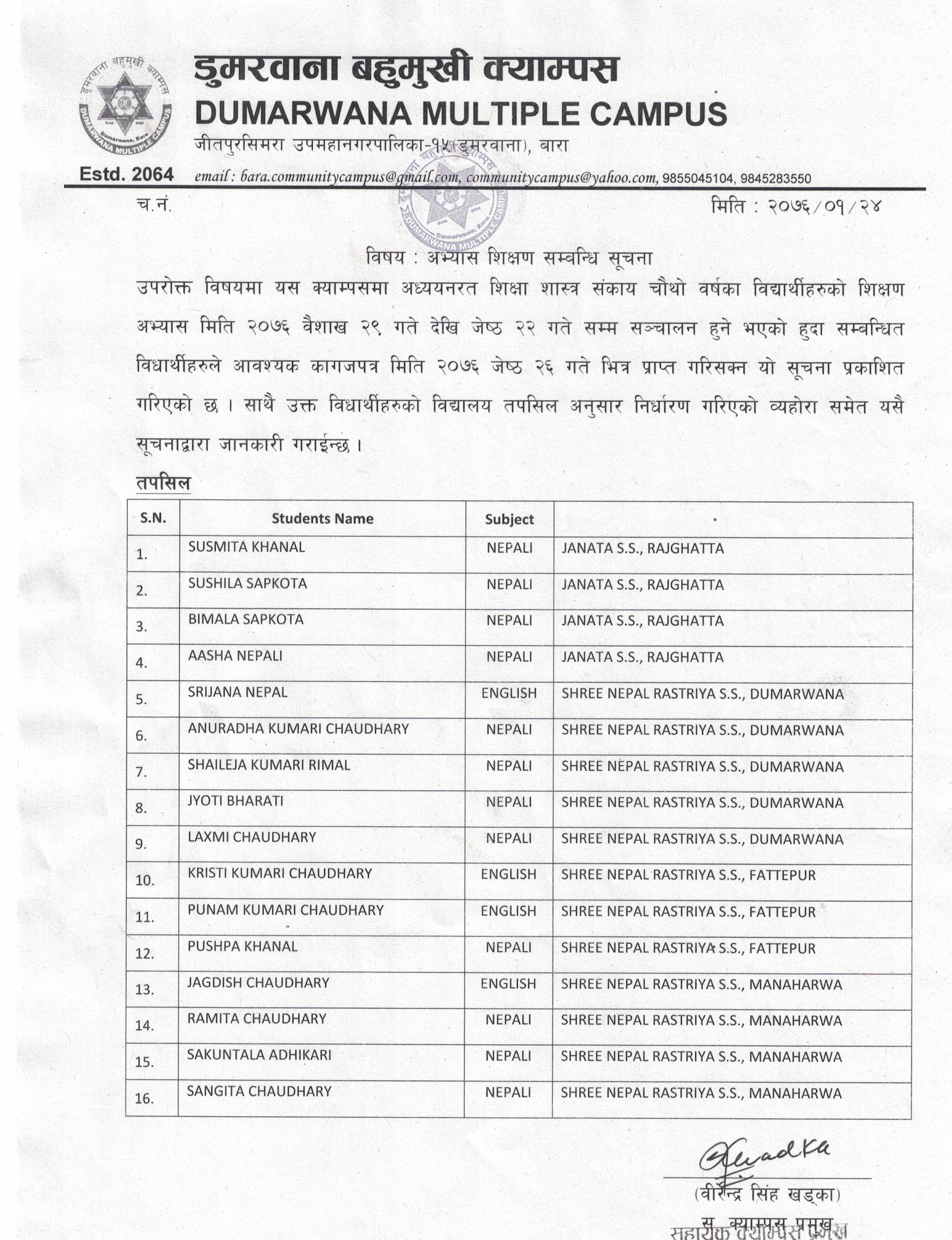Read Moreशिक्षा शास्त्र संकाय चौथो वर्षको विधार्थीहरुको शिक्षण अभ्यास सम्बन्धि सूचना